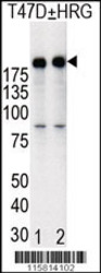 - Western blot analysis of ERBB2 (arrow) in T47D cell lysates, either noninduced (Lane 1) or induced with HRG (Lane 2).(1:250)