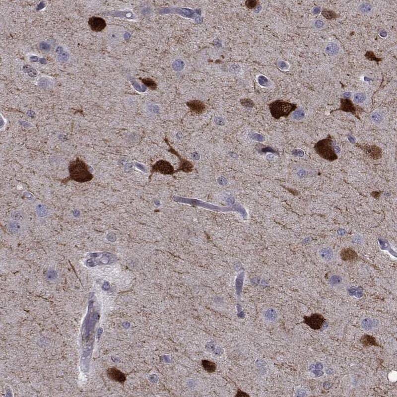 - Immunohistochemical staining of PCP4L1 in human cerebral cortex using PCP4L1 Polyclonal Antibody (Product # PA5-65743) shows high expression.