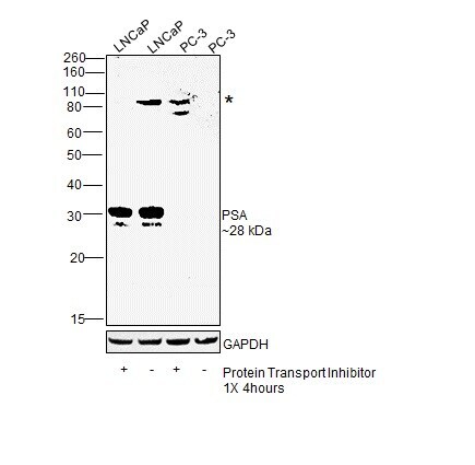 - Western blot was performed using Anti-PSA Polyclonal Antibody(Product # PA1-38514) and a 28kDa band corresponding to PSA, along with an uncharacterized band (*), was observed across positive cell line tested. Whole cell extracts (30 µg lysate) of LNCaP treated with Protein Transport Inhibitor (1X for 4 hours) (Lane 1), LNCaP (Lane 2), PC-3 treated with Protein Transport Inhibitor (1X for 4 hours) (Lane 3) and PC-3 (Lane 4) were electrophoresed using NuPAGE™ 12% Bis-Tris Protein Gel (Product # NP0341BOX). Resolved proteins were then transferred onto a Nitrocellulose membrane (Product # IB23001) by iBlot® 2 Dry Blotting System (Product # IB21001). The blot was probed with the primary antibody (1:1000 dilution) and detected by chemiluminescence with Goat anti-Rabbit IgG (H+L) Superclonal™ Recombinant Secondary Antibody, HRP (Product # A27036, 1:4000 dilution) using the iBright FL 1000 (Product # A32752). Chemiluminescent detection was performed using SuperSignal™ West Dura Extended Duration Substrate (Product # 34076).