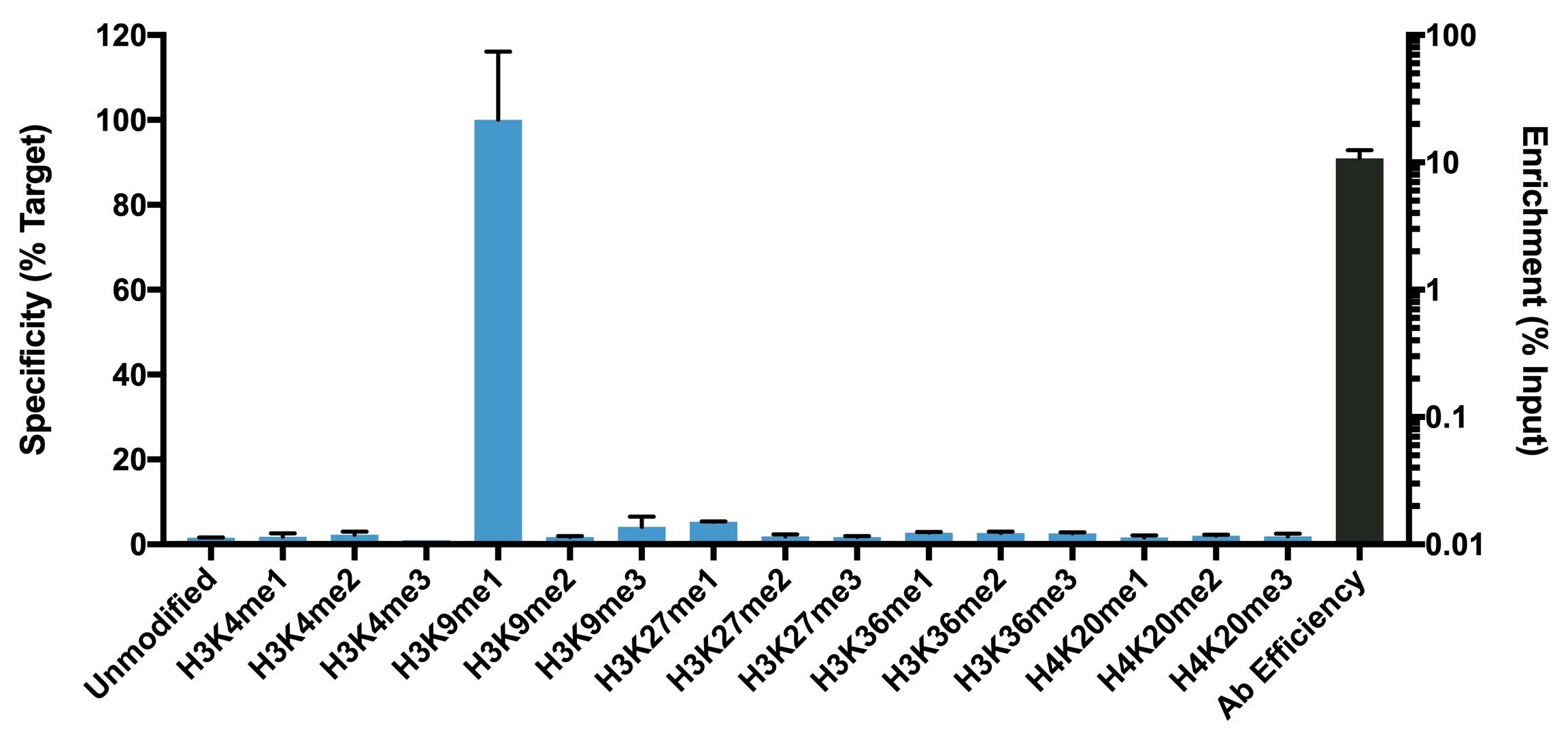 - Antibody specificity was demonstrated by detection of enrichment of the targeted histone modification using SNAP-ChIP™ Spike-in, a proprietary technology developed by EpiCypher™. SNAP-ChIP™ spike-in was performed using H3K9me1 Recombinant Rabbit Monoclonal antibody (Product # MA5-33385) and H3K9me1 was enriched compared to the other histone modifications in the SNAP-ChIP™ K-MetStat Panel (Product # A47356).