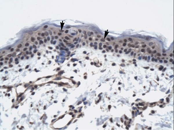 - TAF9 antibody ARP34551_P050-NP_001015891-TAF9 (TAF9 RNA polymerase II, TATA box binding protein (TBP)-associated factor, 32kDa) Antibody was used in IHC to stain formalin-fixed, paraffin-embedded human skin. This image was taken for the unconjugated form of this product. Other forms have not been tested.