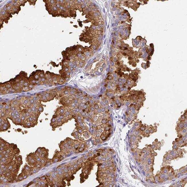 - Immunohistochemical analysis of FAM83C in human prostate using FAM83C Polyclonal Antibody (Product # PA5-62111) shows strong cytoplasmic positivity in glandular cells.