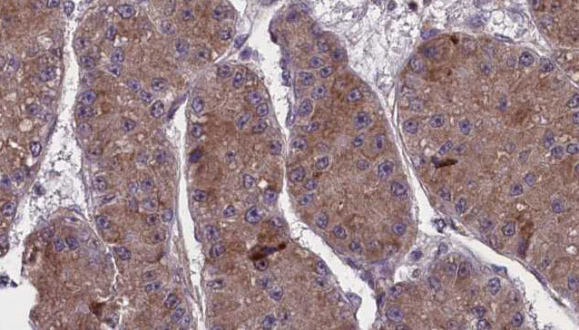 - 1:100 staining human liver carcinoma tissues by IHC-P. The sample was formaldehyde fixed and a heat mediated antigen retrieval step in citrate buffer was performed. The sample was then blocked and incubated with the antibody for 1.5 hours at 22°C. An HRP conjugated goat anti-rabbit antibody was used as the secondary.