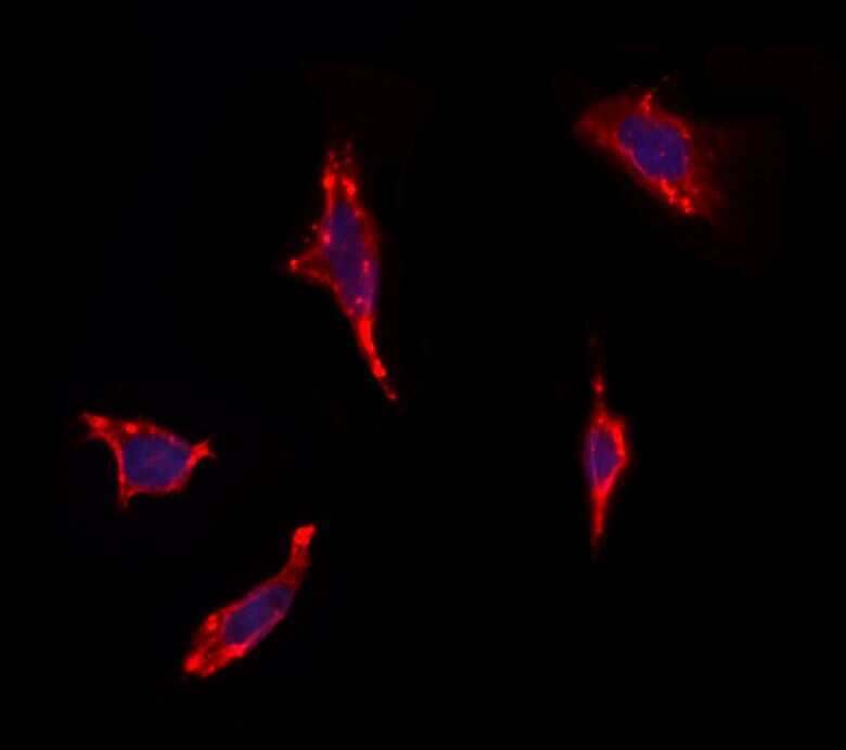 - Immunofluorescent analysis of OR13C5 in HeLa cells. Samples were fixed with paraformaldehyde, permeabilized with 0.1% Triton X-100, blocked with 10% serum (45 min at 25°C) incubated with OR13C5 polyclonal antibody (Product # PA5-99938) using a dilution of 1:200 (1 hr, 37°C), and followed by goat anti-rabbit IgG Alexa Fluor 594 at a dilution of 1:600.