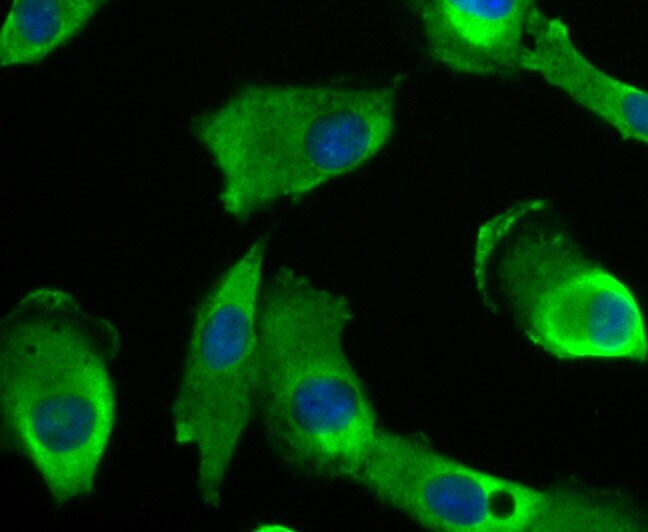 - Immunofluorescent analysis of Niemann Pick C1 in A549 cells (green). Samples were fixed in paraformaldehyde and permeabilised with 0.25% Triton X100/PBS, incubated with Niemann Pick C1 monoclonal antibody (Product # MA5-34694), followed by DAPI (blue).