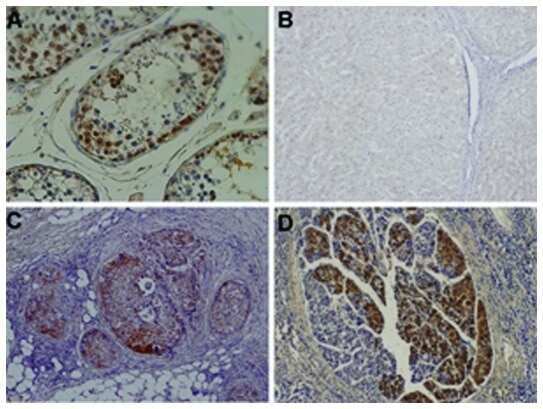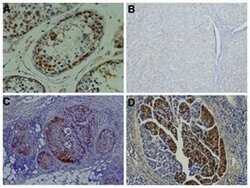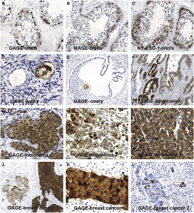 - Figure 2 Comparison of GAGE, MAGE-1 and NY-ESO-1 staining in normal testis, and analysis of GAGE protein expression in ovary and different types of cancer. GAGE ( A ), MAGE ( B ) and NY-ESO-1 ( C ) were detected in spermatogonia and primary spermatocytes of the seminiferous tubuli. However, while MAGE-A1 and NY-ESO-1 were located only in the cytoplasm of these cells, GAGE staining was also present, and more intense, in the nuclei. GAGE was also expressed in oocytes of resting ( D ) and maturing ( E ) follicles of normal ovaries, which also contained GAGE-negative oocytes. In three malignant melanomas, all cells exhibited cytoplasmic staining ( G - I ), whereas nuclear staining was observed in only two melanomas ( G and H ). Heterogeneous staining was also seen in other types of cancer, including lung carcinoma ( F ) and breast carcinoma ( J - L ). One breast carcinoma exhibited variations in both cytoplasmic and nuclear GAGE staining among cells ( J and K ), while only few cells of another breast cancer specimen were positive ( L ). Magnification: x 10 ( A , B , C , E , F , J , L ), x 20 ( G - I ), x 40 ( D , K ).