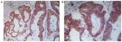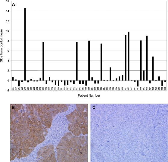 - Figure 3 NY-ESO-1 serum autoantibodies and antigen expression in high-grade serous ovarian cancer. (A) Serum autoantibody responses to NY-ESO-1 in the 35-patient cohort. Autoantibody responses are reported as the number of standard deviations from the mean of 60 age- and gender-matched controls with no known personal history of cancer. (B,C) Immunohistochemical analysis of NY-ESO-1 expression in two representative serous ovarian tumors with high (B) and negative (C) expression of the antigen.
