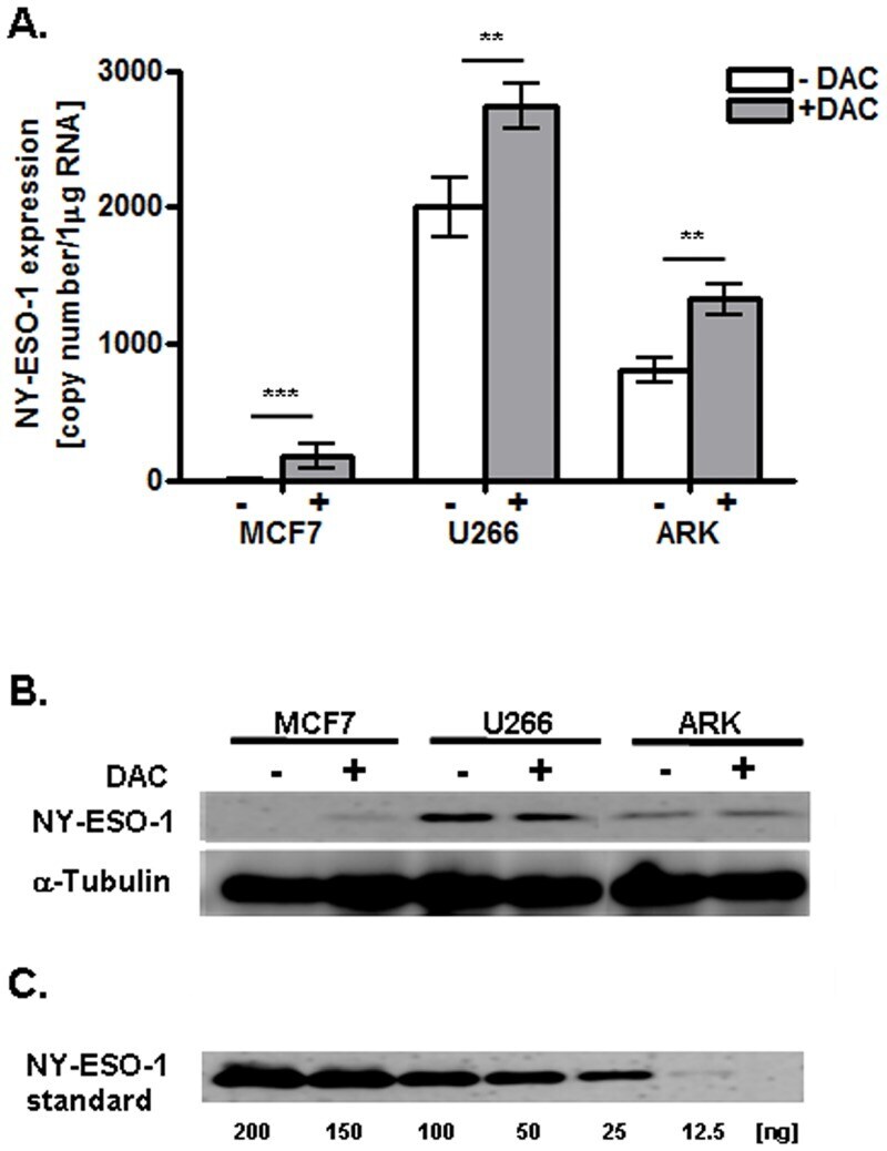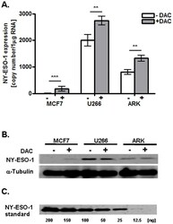 - Fig 2 Effects of DAC treatment on NY-ESO-1 mRNA and protein expression in MCF7, U266, and ARK cell lines. A. NY-ESO-1 specific mRNA, quantified as copy numbers/mug RNA using qRT-PCR. All data are representative of three independent experiments performed in triplicate. B. NY-ESO-1 protein expression analyzed by Western blotting (n = 3). The first and second line show total cell lysate of the respective cell line +/- DAC treatment and detection via a NY-ESO-1 specific or alpha-Tubulin specific (loading control) antibody. The third line shows a Western blot of recombinant NY-ESO-1 protein as control.