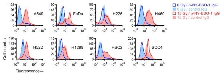 - Figure 2 Effect of radiation on cell surface NY-ESO-1 measurement by fluorescence flow cytometry. Sub-confluent adherent cultures of indicated cell lines that had been grown in parallel to same cell density were treated with 0 or 15 Gy X-rays. After four days, adherent cells were collected by scraping and examined by flow cytometry for binding of an unconjugated mouse IgG1 antibody against NY-ESO-1. Antibody binding was indirectly detected with a fluorophore-conjugated rat antibody against mouse IgG. Binding of a control IgG1 (normal mouse serum fraction) was similarly detected. Shown are representative histograms of viable cells identified by 7 -amino-actinomycin D staining.