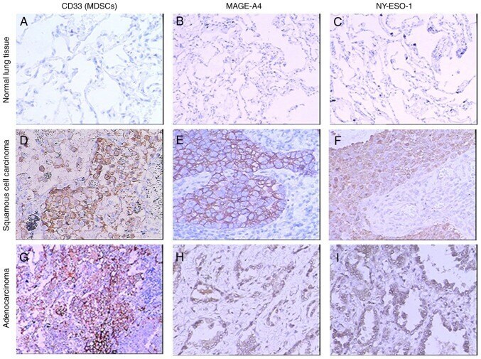 - Figure 1. Immunohistochemical findings for MAGE-A4, NY-ESO-1 and CD33 in non-small cell lung cancer tissues. Specimens from the normal lung were used as a negative control. Staining of the normal lung demonstrated no reactivity for (A) CD33, (B) MAGE-A4 and (C) NY-ESO-1. Expression of (D) CD33, (E) MAGE-A4 and (F) NY-ESO-1 in squamous cell carcinoma. Expression of (G) CD33, (H) MAGE-A4 and (I) NY-ESO-1 in adenocarcinoma. Magnification, x100. MDSCs, myeloid derived suppressor cells; MAGE-A4, melanoma-associated antigen 4; NY-ESO-1, New York esophageal squamous cell carcinoma-1.