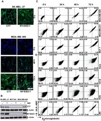 - Figure 2 gamma-radiation up-regulates CT-antigens and MHC-I molecules on the protein level. (A) Immunofluorescence of MDA-MB-469 and SK-MEL-37 cells exposed to a single dose irradiation of 20 Gy and stained with antibodies against NY-ESO-1 and CT7 at different time points after irradiation. (B) MDA-MB-469, SK-MEL-37 and MCF 10A cell lines were exposed to a single dose of 20 Gy and the expression of NY-ESO-1 and CT7 was analyzed by Western blotting 72 h later. (C) breast cancer and (D) osteosarcoma cell lines were exposed to single dose irradiation of 20 Gy and the expression of HLA-ABC and beta 2 microglobulin was quantified at different time points after irradiation by flow cytometry. RAD: indicates gamma-radiation.