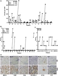 - Figure 4 Analysis of the T cell response in a patient with autoantibodies to NY-ESO-1 showing the presence of NY-ESO-1 reactive CD8+ T cells in ascites and tumor despite the lack of NY-ESO-1 expression in solid tumor. (A) MHC class I pentamer analysis demonstrating enrichment of NY-ESO-1-specific CD8+ T cells in ascites and solid tumor compared to peripheral blood. The boxed areas and associated numbers represent the percentage of pentamer-positive cells relative to total CD8+ cells. (B) ELISPOT analysis of IFN-gamma production by T cells after stimulation with an HLA-A2-binding peptide from NY-ESO-1. Data is presented as the number of IFN-gamma-producing cells per 1x10 6 bulk cells from the indicated tissue compartments. (C) Immunohistochemical analysis of tumor-infiltrating CD3+ and CD8+ T cells in tumor stroma, and expression of NY-ESO-1 antigen. While the solid tumor was negative for expression of NY-ESO-1, a fraction of cells from ascites were positive. The cellular fraction of ascites also contained cytokeratin-positive epithelial cells, presumably of tumor origin (data not shown).