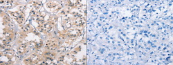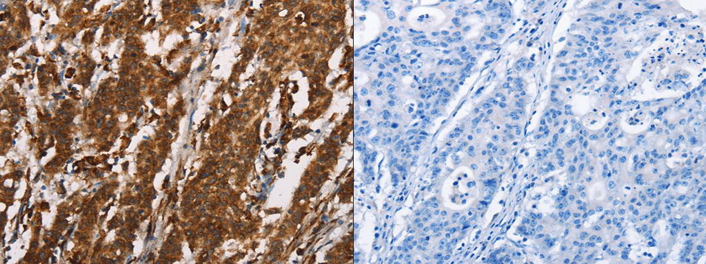 - The image on the left is immunohistochemistry of paraffin-embedded Human gastic cancer tissue using (CTAG1A/B Antibody) at dilution 1/25, on the right is treated with synthetic peptide. (Original magnification: ?200)