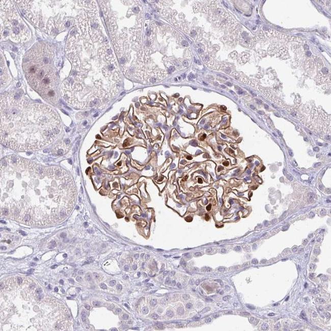 - Immunohistochemical staining of DDN in human kidney tissue shows moderate membranous, cytoplasmic and nuclear positivity in cells in glomeruli. Samples were probed using a DDN Polyclonal Antibody (Product # PA5-63915).