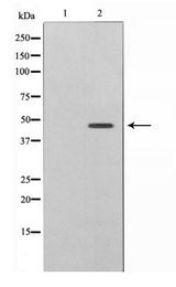 - Western blot of Caspase 9 phosphorylation expression in TNF treated HeLa whole cell lysates,The lane on the left is treated with the antigen-specific peptide.