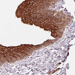 - Immunohistochemical analysis of SMLR1 in human urinary bladder using SMLR1 Polyclonal Antibody (Product # PA5-64262) shows strong membranous and cytoplasmic positivity in urothelial cells.