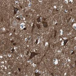 - Immunohistochemical staining of human cerebral cortex shows strong cytoplasmic positivity in neuronal cells.