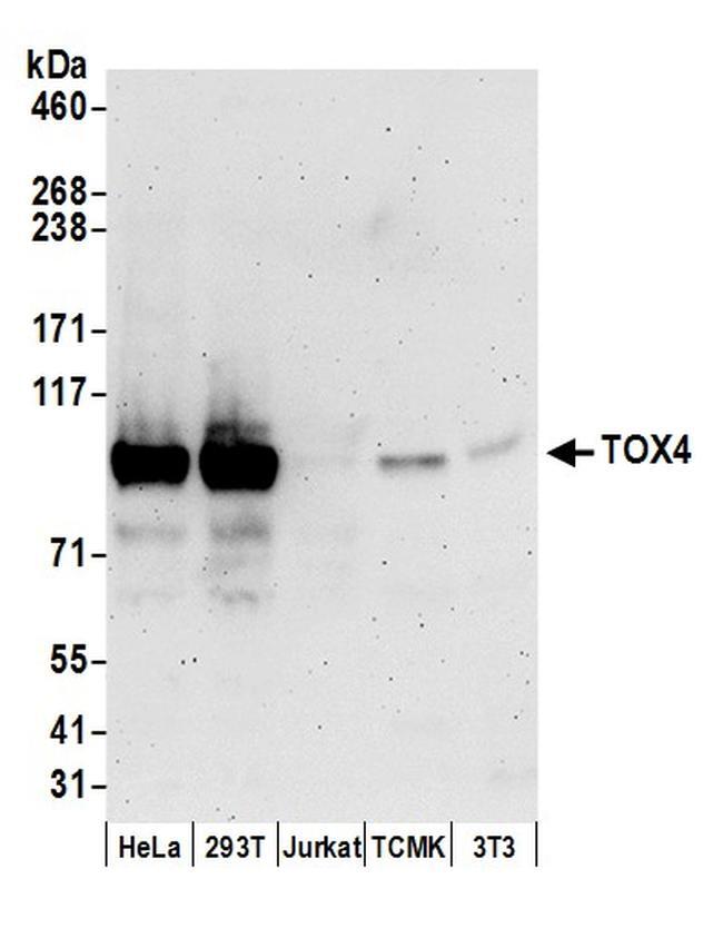 - Detection of human and mouse TOX4 by western blot. Samples: Whole cell lysate (50 µg) from HeLa, 293T, Jurkat, mouse TCMK-1, and mouse NIH3T3 cells prepared using NETN lysis buffer. Antibody: Affinity purified rabbit anti-TOX4 antibody A304-873A-M (lot A304-873A-M-1) used for WB at 1:1000. Detection: Chemiluminescence with an exposure time of 3 minutes.