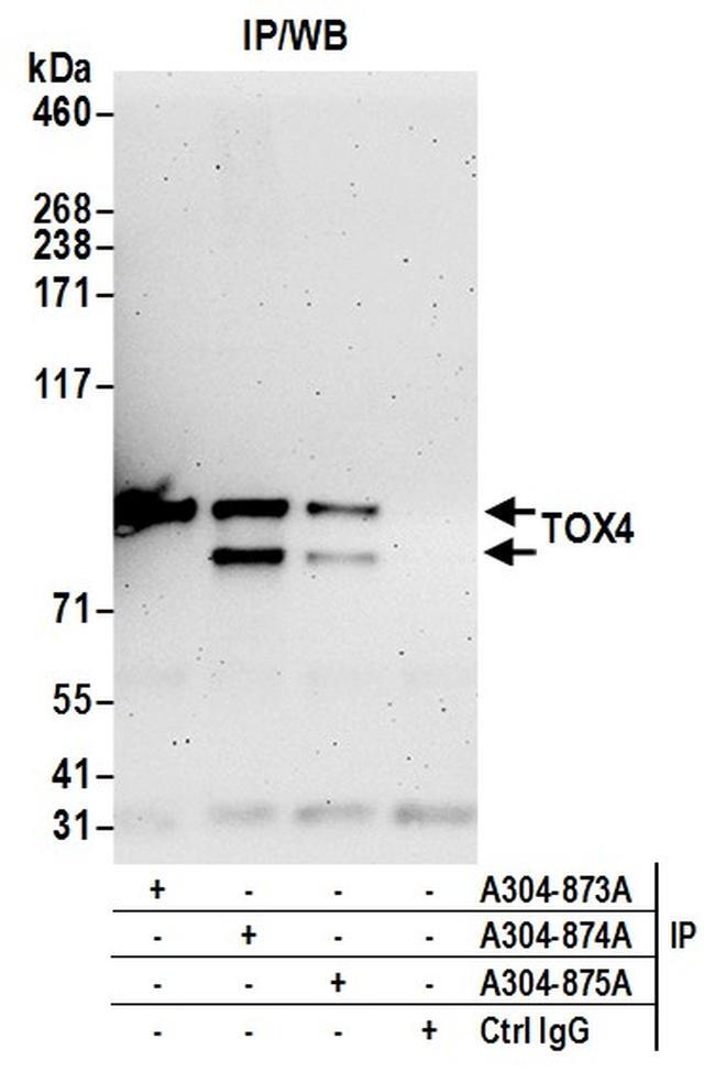 - Detection of human TOX4 by western blot of immunoprecipitates. Samples: Whole cell lysate (0.5 or 1.0 mg per IP reaction; 20% of IP loaded) from 293T cells prepared using NETN lysis buffer. Antibodies: Affinity purified rabbit anti-TOX4 antibody A304-874A (lot A304-874A-1) used for IP at 6 µg per reaction. TOX4 was also immunoprecipitated by rabbit anti-TOX4 antibodies A304-873A and A304-875A. For blotting immunoprecipitated TOX4, A304-874A was used at 1 µg/ml. Detection: Chemiluminescence with an exposure time of 3 minutes.