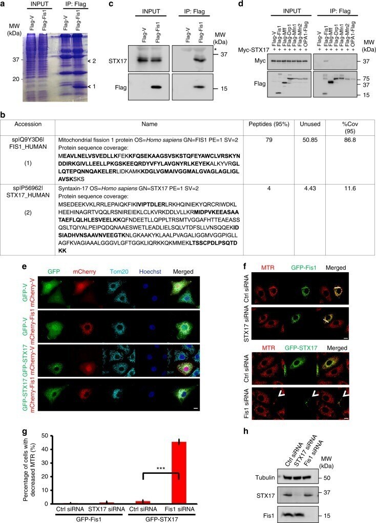 - Fig. 1 Mitochondrial fission 1 protein (Fis1) and syntaxin 17 (STX17) interact and partially colocalize. a , b HeLa cells were transfected with Flag-tagged vector or Fis1. After 24 h, cells were collected for immunoprecipitation (IP) with anti-Flag beads. Coomassie blue staining was used to visualize bands 1 and 2 ( a ). Results for mass spectrometry analysis of band 1 and 2 are summarized ( b ). c Cells treated as in a were extracted. Anti-Flag immunoprecipitates were separated by sodium dodecyl sulfate-polyacrylamide gel electrophoresis (SDS-PAGE) and immunoblotted for STX17 and Flag. Asterisk indicates a non-specific band. d HEK293T cells were co-transfected with Myc-tagged STX17 and Flag-tagged plasmids as indicated. Cells were solubilized for IP with anti-Flag and analyzed with Myc and Flag antibodies respectively. e HeLa cells were transfected with green fluorescent protein (GFP)-tagged vector or STX17 (green) and mCherry-tagged vector or plasmid encoding Fis1 (red) for 24 h. Cells were fixed and stained with anti-Tom20 (cyan). Hoechst, blue. Scale bar, 10 um. f HeLa cells were treated with the indicated small interfering RNA (siRNA) for 24 h before transfecting with GFP-tagged Fis1 (green) or GFP-STX17 (green) for further 24 h. Representative confocal images of live cells are shown. Mitochondrial morphology was visualized using MitoTracker Red (MTR, red). Scale bar, 10 um. White arrowhead indicates cells with decreased MTR. g Quantification of cells with
