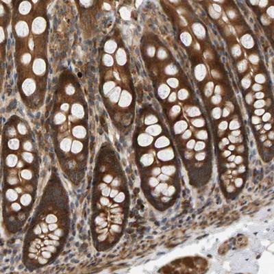 - Immunohistochemistry: BAHCC1 Antibody [NBP1-91067] - Staining of human colon shows strong cytoplasmic positivity in glandular cells.