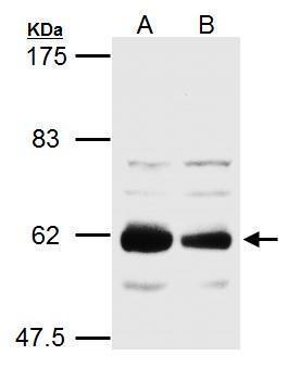 - SQSTM1 antibody detects SQSTM1 protein by Western blot analysis.A. 20 µg Huh7 whole cell lysate/extract (untreated) B. 20 µg Huh7 whole cell lysate/extract (3uM-Thapsipargin treatment for 12hr)0 % SDS-PAGESQSTM1 antibody (GTX111393) dilution: 1:1500