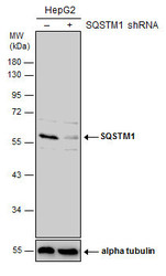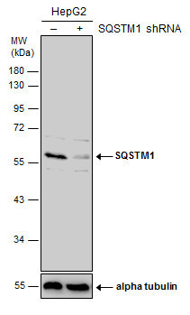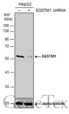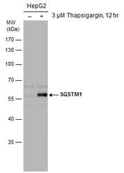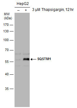 - Untreated (¡V) and treated (+) HepG2 whole cell extracts (30 £gg) were separated by 10% SDS-PAGE, and the membrane was blotted with SQSTM1 antibody (GTX111393) diluted at 1:10000.