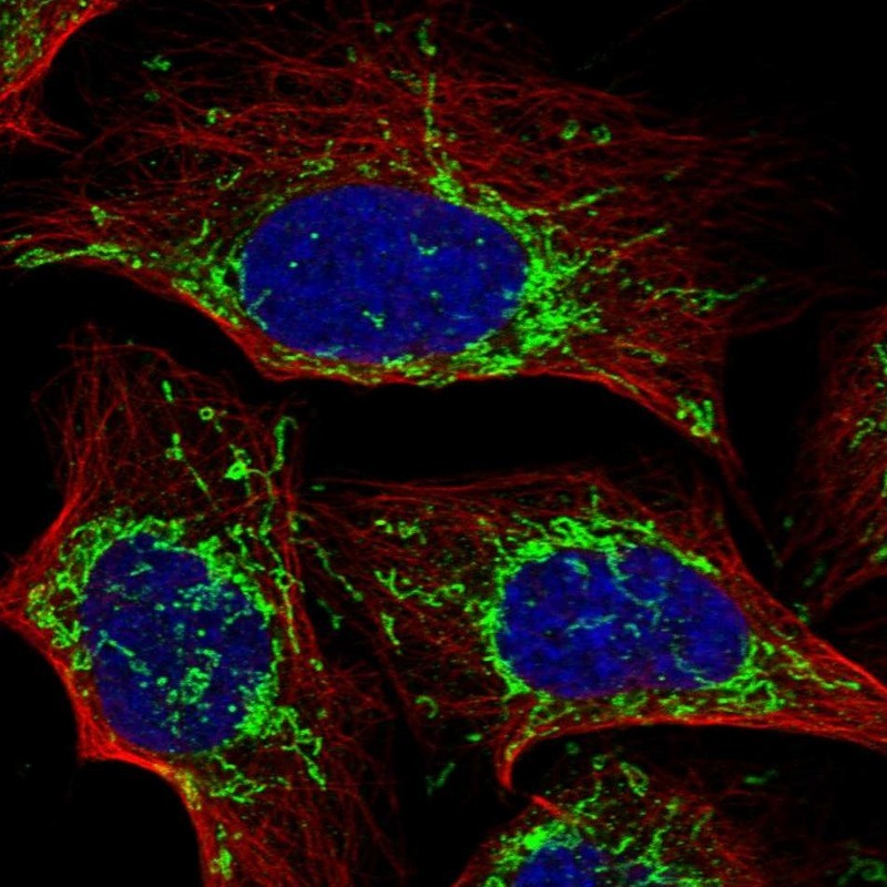 - Immunofluorescent staining of human cell line U-2 OS shows localization to mitochondria.