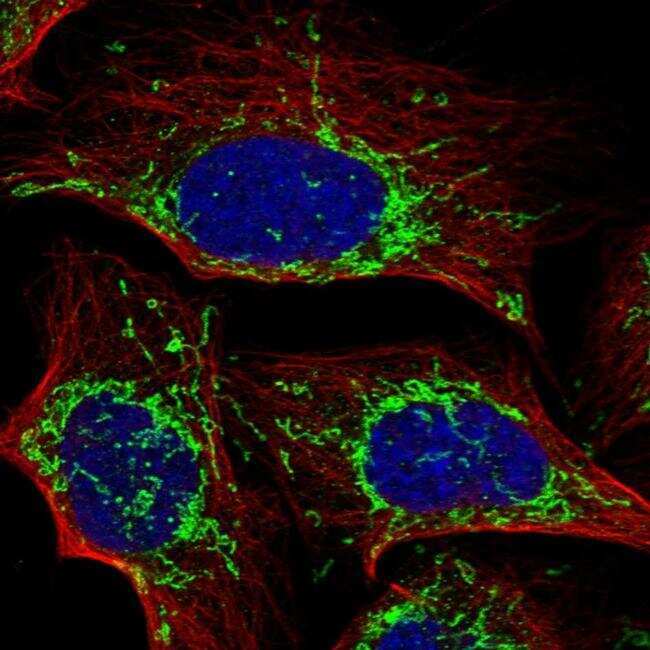 - Immunofluorecent analysis of C5orf63 in human cell line U-2 OS using C5orf63 Polyclonal Antibody (Product # PA5-60289). Staining shows localization to mitochondria.