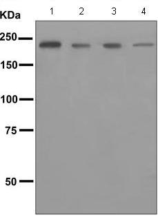 - Western blot - Anti-LY75 antibody [EPR5233]; All lanes : Anti-LY75 antibody [EPR5233] at 1/1000 dilution.Lane 1 : Human thymus lysate.Lane 2 : Human lymph node lysate.Lane 3 : Human tonsil lysate.Lane 4 : Mouse thymus lysate.Lysates/proteins at 10 ug per lane.Secondary.Goat anti-Rabbit HRP at 1/2000 dilution.Predicted band size : 198 kDa.