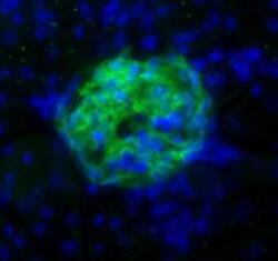 - Podoplanin Antibody (8.1.1) - Lymphatic Endothelium Marker - Podoplanin (8.1.1) antibody labeling (green) of glomeruli from mouse kidney. Nuclei were counterstained with DAPI (blue). This image was taken for the unconjugated form of this product. Other forms have not been tested.