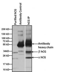 - Immunoprecipitation of hCG proteins was performed by spiking 5 ugs of purified hCG extracted from human urine into 1 mL of 1:2 diluted human urine sample. Antigen-antibody complexes were formed by incubating with 5 µg of hCG antibody (Product # MA5-14680) overnight on end over end tube rotator at 4C. The immune complexes were captured by using 50 µL Protein A/G Agarose (Product # 20421), washed extensively, and eluted with Lane Marker Reducing Sample Buffer (Product # 39000). Samples were resolved on a 4-20% Tris-HCl polyacrylamide gel, transferred to a PVDF membrane (Product # 88518), and blocked with 5% milk for at least 1 hour at room temperature. hCG was detected at ~32 & 22 kD using hCG monoclonal antibody (Product # MA5-14680) at a concentration of 4 µg/mL in blocking buffer overnight at 4C on a rocking platform, followed by an HRP-conjugated goat anti-mouse IgG (Fc) secondary antibody (Product # 31439) at a dilution of 1:10,000 for at least 1 hour. Chemiluminescent detection was performed using SuperSignal West Dura (Product # 34076).