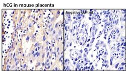- Immunohistochemistry analysis of hCG was performed on human placenta tissue and is showing positive staining in extra cellular spaces. To expose target proteins, antigen retrieval was performed by microwaving tissues for 20 minutes in 10mM sodium citrate buffer (pH 6.0). Tissue slides were probed with hCG monoclonal antibody (Product # MA5-14680) at a dilution of 1:20, overnight at 4C in a humidified chamber without (right panel) or with hCG antibody (left panel). Tissues were washed, and incubated with secondary antibody (conjugated with HRP) for 30 min at room temperature in a humidified chamber. Detection was performed using a DAB substrate kit. Tissues were counterstained with hematoxylin and dehydrated to prep for mounting. Images were taken at 20x magnification.