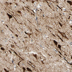 - Immunohistochemical staining of human cerebral cortex with ANKHD1-EIF4EBP3 polyclonal antibody (Cat # PAB27464) shows strong cytoplasmic positivity in neuronal cells at 1:50-1:200 dilution.