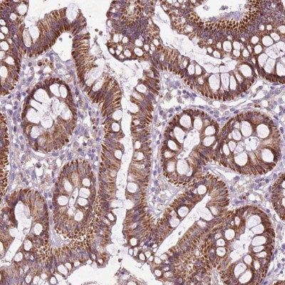 - Immunohistochemistry: THEGL Antibody [NBP2-49543] - Staining of human colon shows strong granular cytoplasmic positivity in glandular cells.