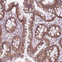 - Immunohistochemical analysis of THEGL in human colon using THEGL Polyclonal Antibody (Product # PA5-64358) shows strong granular cytoplasmic positivity in glandular cells.