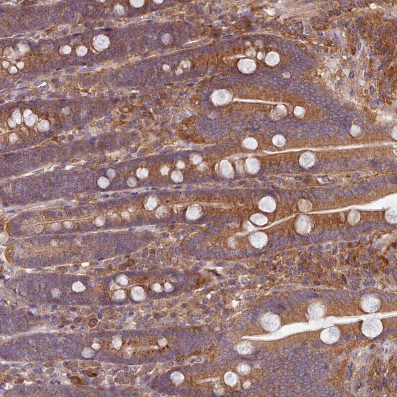 - Immunohistochemical staining of FAM21A in human duodenum using a FAM21A Polyclonal Antibody (Product # PA5-61604) shows moderate cytoplasmic positivity.