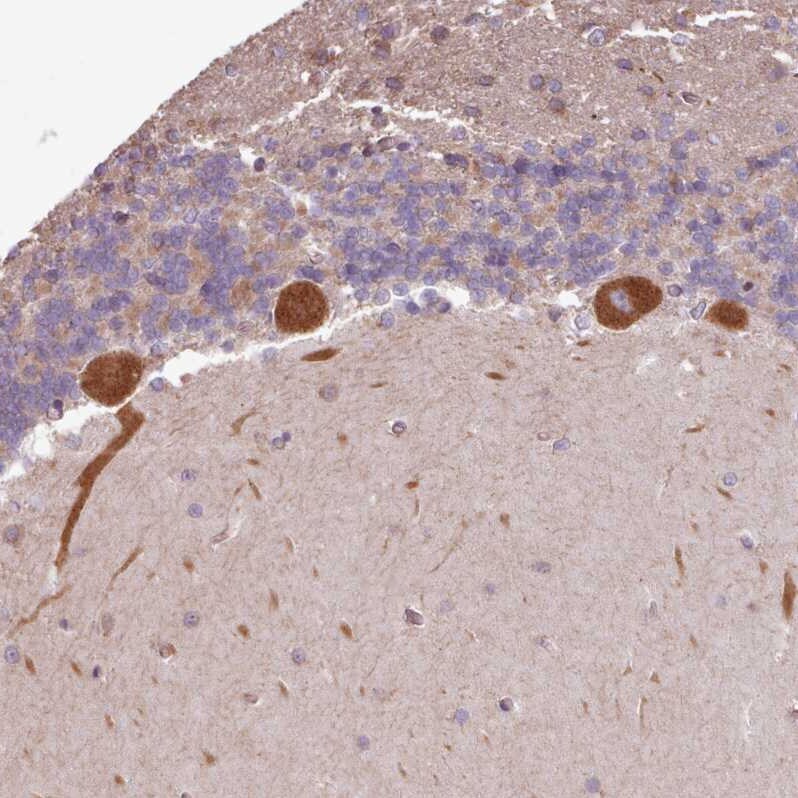- Immunohistochemical analysis of FAM21A in human cerebellum using FAM21A Polyclonal Antibody (Product # PA5-61604) shows strong cytoplasmic positivity in Purkinje cells.