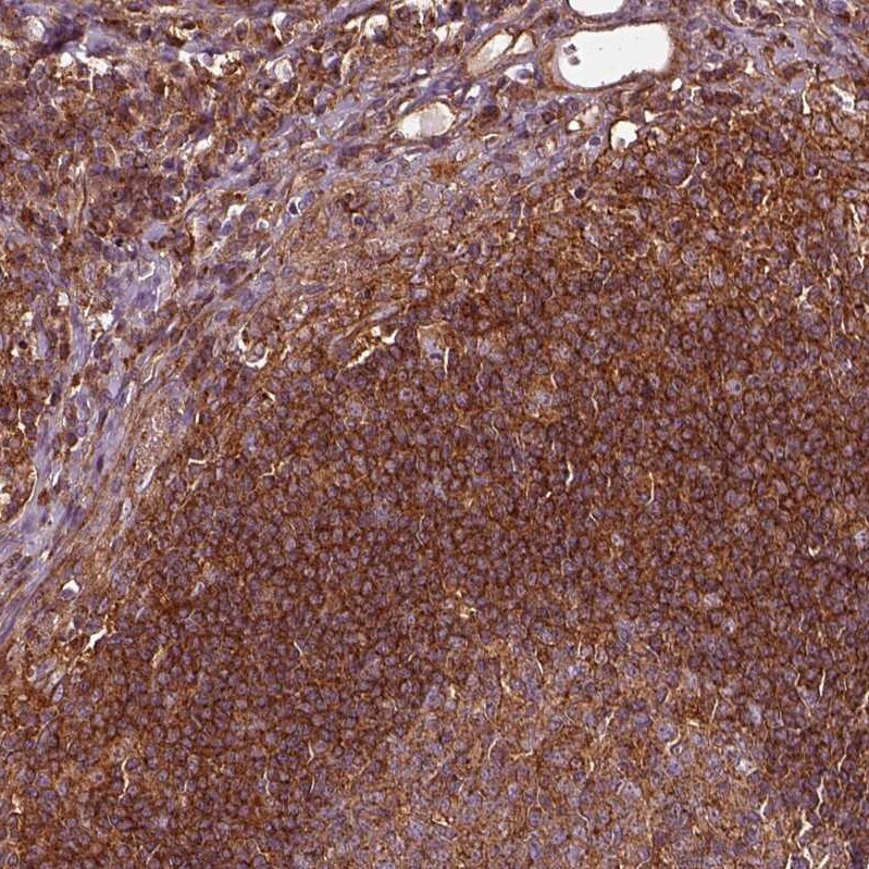 - Immunohistochemical analysis of FAM21A in human lymph node using FAM21A Polyclonal Antibody (Product # PA5-66355) shows strong cytoplasmic granular positivity in non-germinal center cells.
