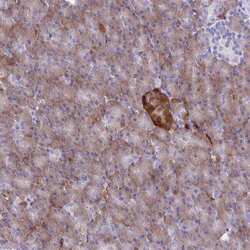 - Immunohistochemical analysis of FAM86B1 in human pancreas using FAM86B1 Polyclonal Antibody (Product # PA5-63164) shows moderate cytoplasmic positivity in exocrine glandular cells.