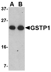 - Western blot of GSTP1 in Jurkat cell lysate with GSTP1 antibody at (A) 0.5 and (B) 1 ug/ml.
