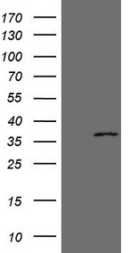 - HEK293T cells were transfected with the pCMV6-ENTRY control. (Left lane) or pCMV6-ENTRY EBLN2. (Right lane) cDNA for 48 hrs and lysed. Equivalent amounts of cell lysates. (5 ug per lane) were separated by SDS-PAGE and immunoblotted with anti-EBLN2. (1:500)