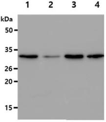 - Western Blot: GSTT2 Antibody (AT10H4) [NBP2-50577] - The cell lysates were resolved by SDS-PAGE, transferred to PVDF membrane and probed with anti-human GSTT2 antibody. Proteins were visualized using a goat anti-mouse secondary antibody conjugated to HRP and an ECL detection system. Lane 1.: HepG2 cell lysate Lane 2.: NIH/3T3 cell lysate Lane 3.: A549 cell lysate Lane 4.: Raw264.7 cell lysate