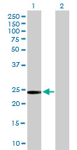 - Western Blot analysis of GSTT2 expression in transfected 293T cell line (H00002953-T02) by GSTT2 MaxPab polyclonal antibody.Lane 1: GSTT2 transfected lysate(26.84 KDa).Lane 2: Non-transfected lysate.