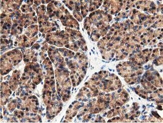 - Immunohistochemical analysis of GSTT2 in paraffin-embedded human pancreas tissue using a GSTT2 monoclonal antibody (Product # MA5-25270) at a dilution of 1:150.