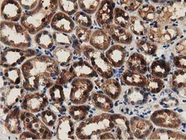- Immunohistochemical analysis of GSTT2 in paraffin-embedded human kidney tissue using a GSTT2 monoclonal antibody (Product # MA5-25270) at a dilution of 1:150.