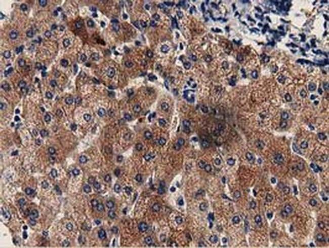 - Immunohistochemical analysis of GSTT2 in paraffin-embedded human liver tissue using a GSTT2 monoclonal antibody (Product # MA5-25270) at a dilution of 1:150.