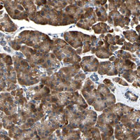 - Immunohistochemical staining of human pancreas with TMED7-TICAM2 polyclonal antibody (Cat # PAB28224) shows strong cytoplasmic positivity in exocrine glandular cells at 1:50-1:200 dilution.