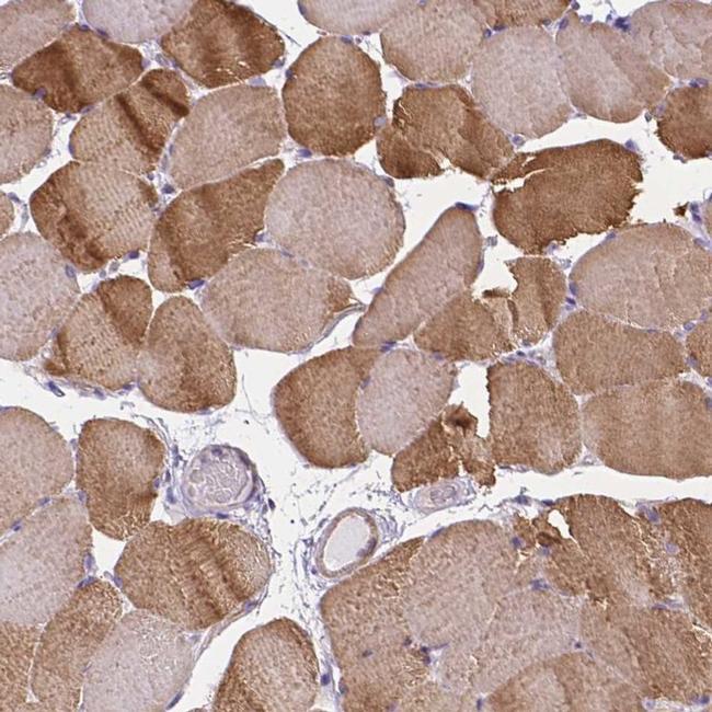 - Immunohistochemical staining of UBAP1L in human skeletal muscle shows strong cytoplasmic positivity in myocytes. Samples were probed using an UBAP1L Polyclonal Antibody (Product # PA5-64349).