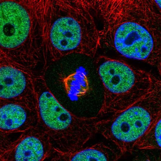 - Immunofluorescent staining of SMIM5 in human cell line MCF7 shows positivity in microtubule organizing center & nucleus but excluded from the nucleoli. Samples were probed using a SMIM5 Polyclonal Antibody (Product # PA5-64455).